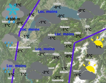 Ciel ensoleillé le matin, puis devenant plus couvert par le sud en après-midi. Quelques flocons possibles en fin de journée par le Mont Blanc. Les températures affichent une petite hausse l'après-midi.