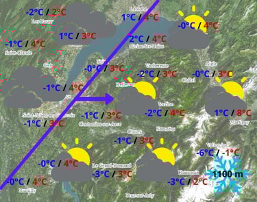 Ciel assez chaotique avec des nuages nombreux à l'est et des précipitations en atténuations sur l'ouest en passant par Morzine et Chamonix. Quelques gouttes ou flocons (dès 1100 à 1500 m d'altitude) seront possibles en Lausanne et Samoëns. Les températures restent fraîches mais un peu au-dessus des normes en montagne.