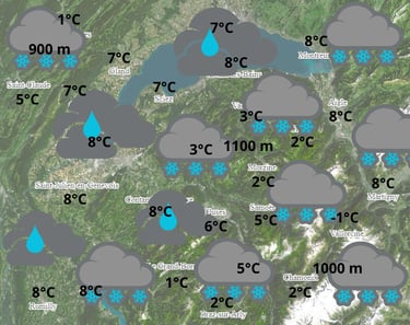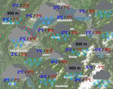 Les précipitations pluvieuses en plaine et neigeuse au-dessus de 800 m s'arrêtent de tomber dès 07h. Le reste de la journée sera soumis à une alternance de passages nuageux (entre voile nuageux et ciel couvert). De nouvelles chutes de neige en montagne sont attendues la nuit suivante vers 1000 m d'alt. Les températures sont fraîches le matin et particulièrement douces en seconde partie de journée.