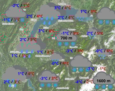 Nouvelle perturbation avec de la neige à basse altitude jusqu'en milieu de journée avant d'entamer une hausse jusqu'à 1600 m d'altitude ! Les dégâts sur le manteau neigeux seront heureusement minces. Les températures sont fraîches mais homogènes entre 300 et 1200 m d'altitude (plutôt une mauvaise nouvelle pour les stations de ski).