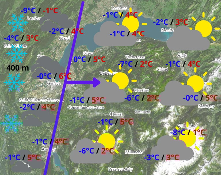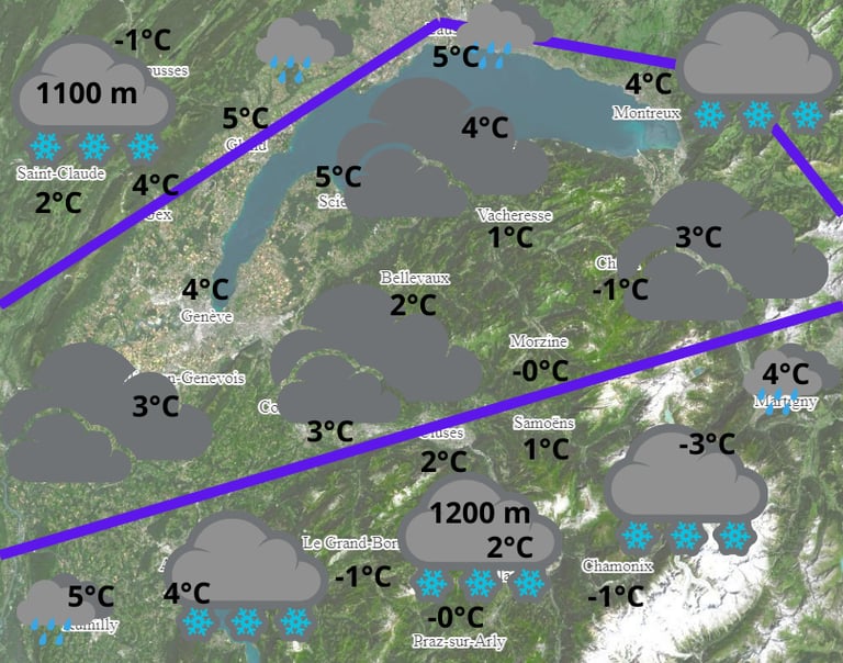 Ciel couvert le matin, souvent accompagné d'averses de neige en montagne dès 1000 m environ, tandis qu'un rigoureux front froid abordera le secteur par le Jura le matin et les Alpes en après-midi. Une forte baisse du mercure est à attendre, avec une baisse de la limite pluie/neige sous les 500 m d'altitude en soirée. Le front s'estompe vers minuit environ. La bise soufflera à plus de 50/60 km/h en seconde partie de journée notamment.