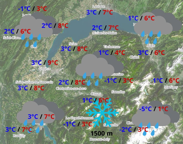 Pluies faibles toute la journée avec des cumuls souvent compris entre 6 et 15 mm (voire très localement 25 mm sur le Grand Massif). Les températures baissent d'un petit cran mais restent très élevées pour la saison. La limite pluie/neige est prévue autour de 1500 m d'altitude (sans pouvoir exclure une baisse vers 1200 m d'altitude ou une hausse vers 1600 m).