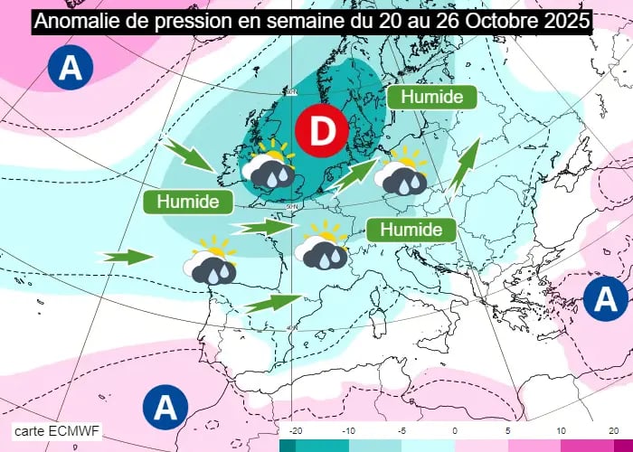 Anomalie de pression atmosphérique de 20 au 26.10 prévu par le modèle ECMWF (Météo France)